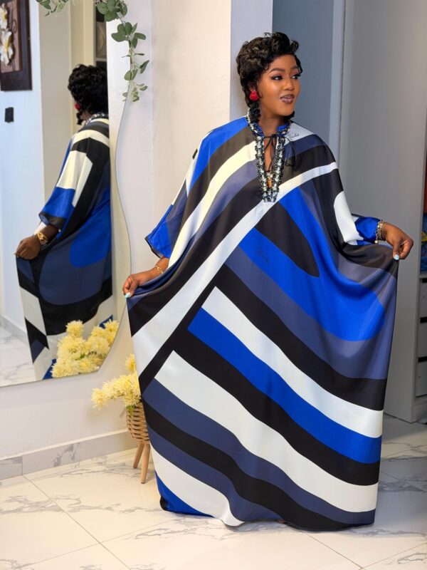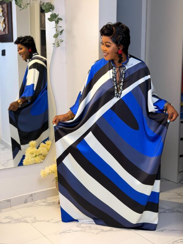 Make waves in style with the Ocean Wave Kaftan, featuring bold ocean-inspired prints in striking shades of blue, black, and white.