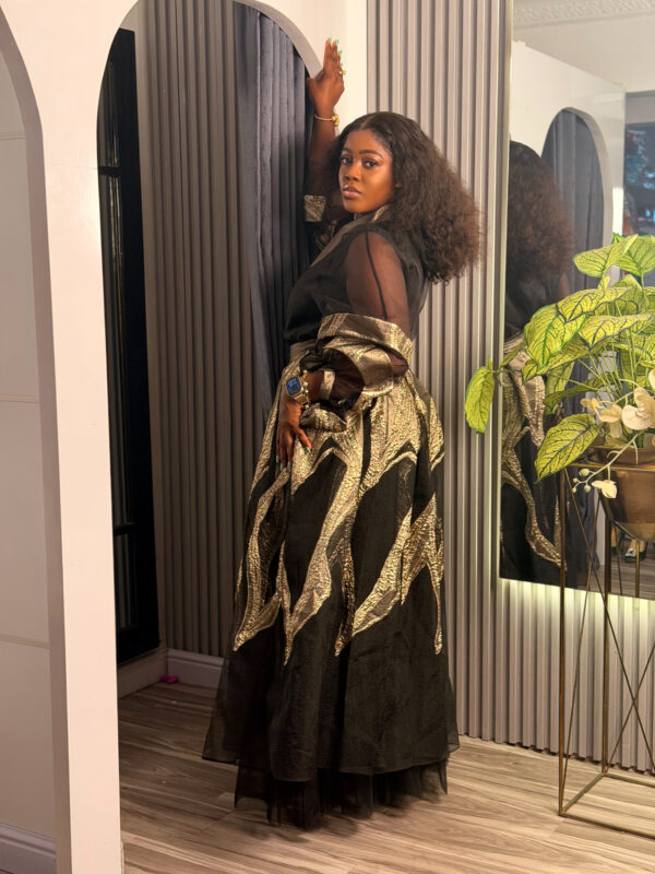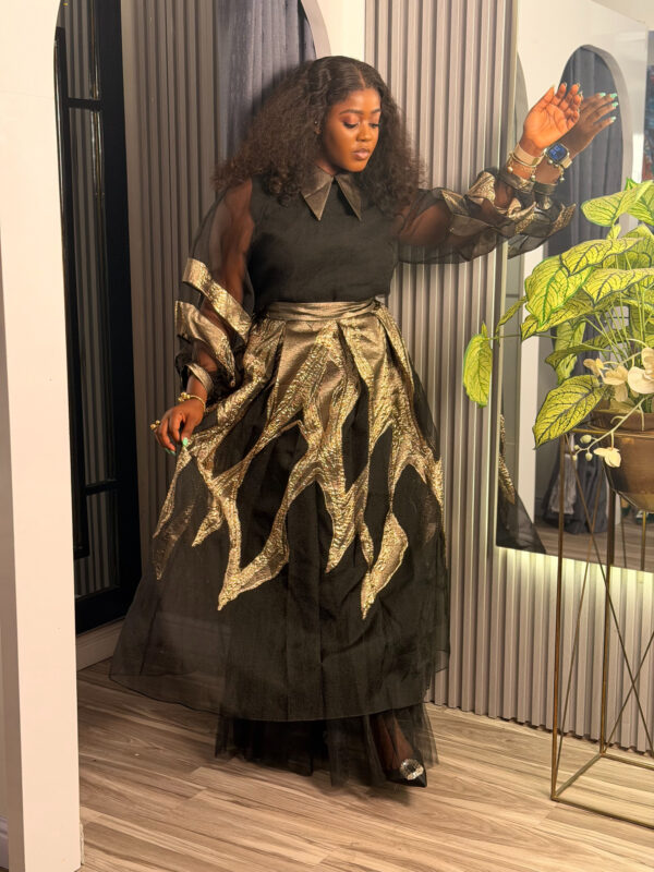 The sheer, voluminous sleeves add graceful drama, while the gold-accented skirt moves beautifully with every step. Perfect for high-end events, celebrations, and statement moments, this set delivers versatility, confidence, and unforgettable style.